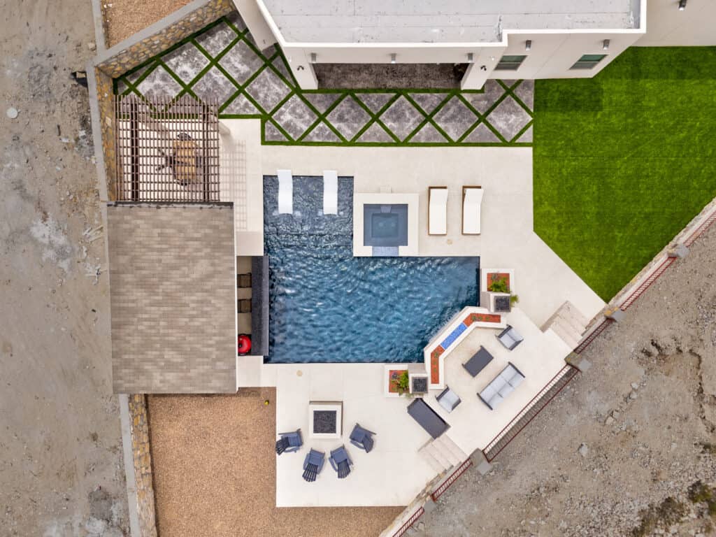 Aerial view of a modern backyard with a custom rectangular pool, raised spa, fire feature, and turf lawn designed by Eraland’s Custom Pools in El Paso, TX.