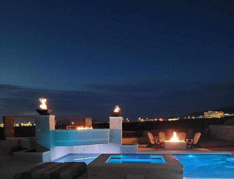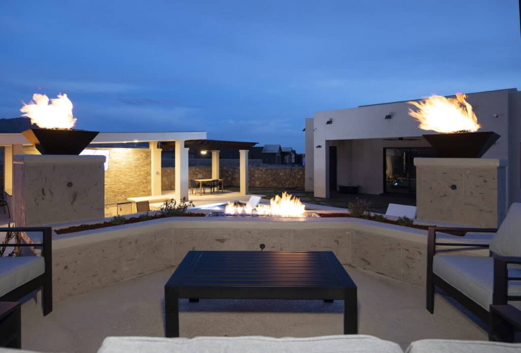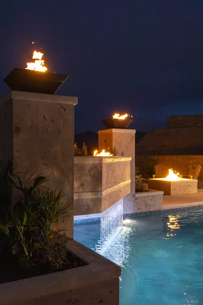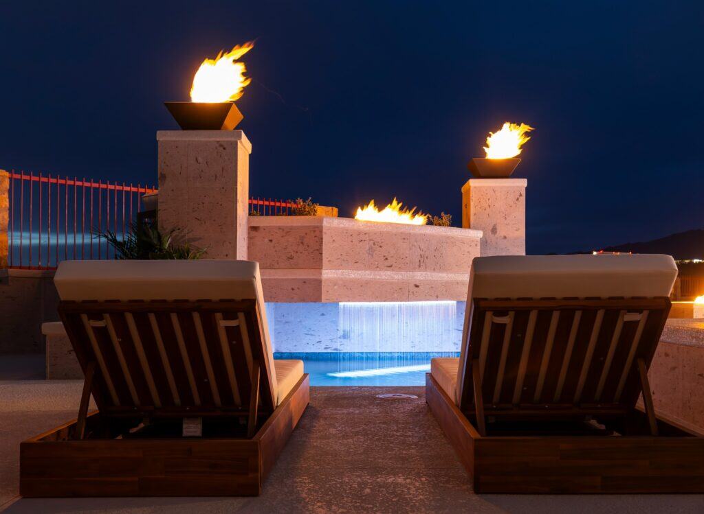 A raised terrace serves as the focal point of the backyard, combining linear fire features, fire bowls, and integrated water elements. Positioned above the pool, the terrace creates a strong architectural presence while enhancing both daytime views and nighttime ambiance.