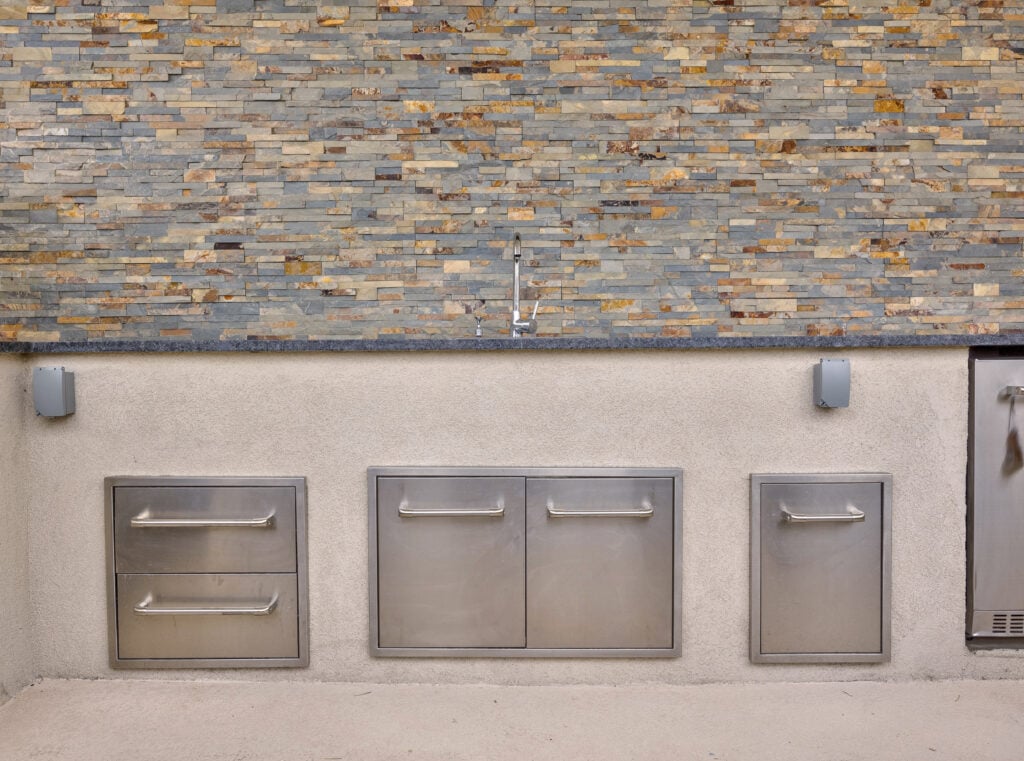 A fully integrated outdoor kitchen and shaded structure extend the usability of the space for entertaining and daily use.