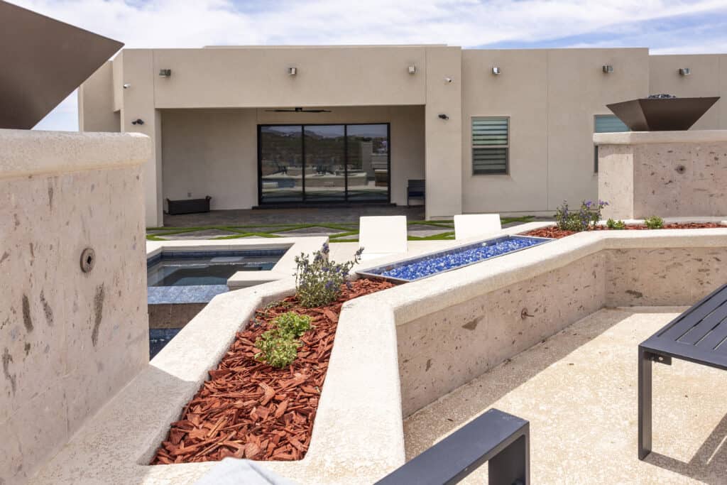 A refined outdoor living space designed with clean geometry, integrated fire and water features, and layered gathering areas.