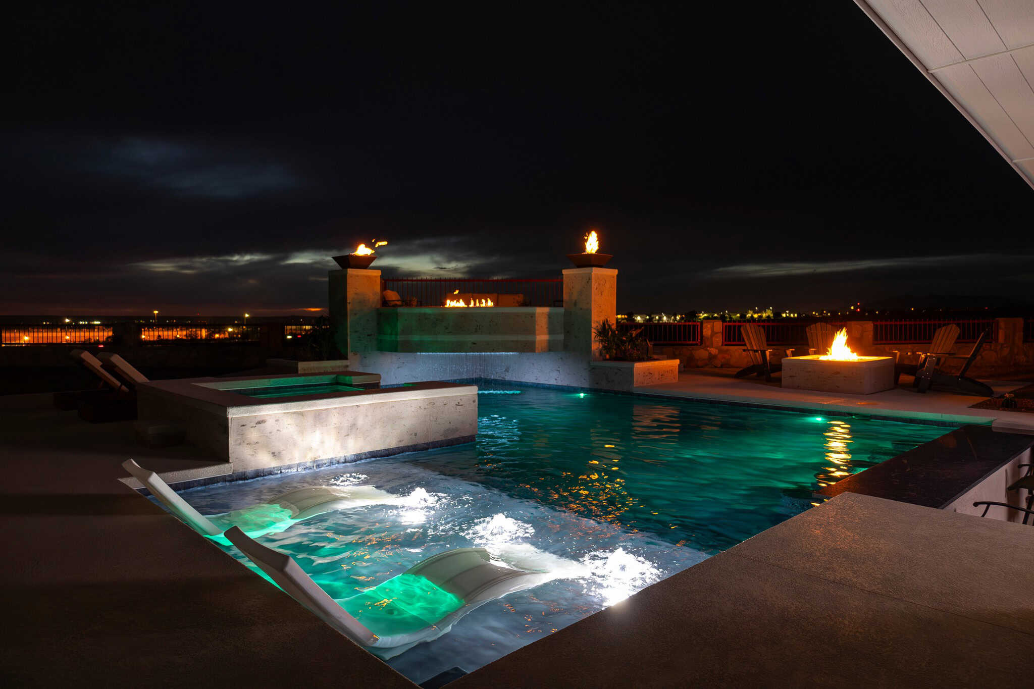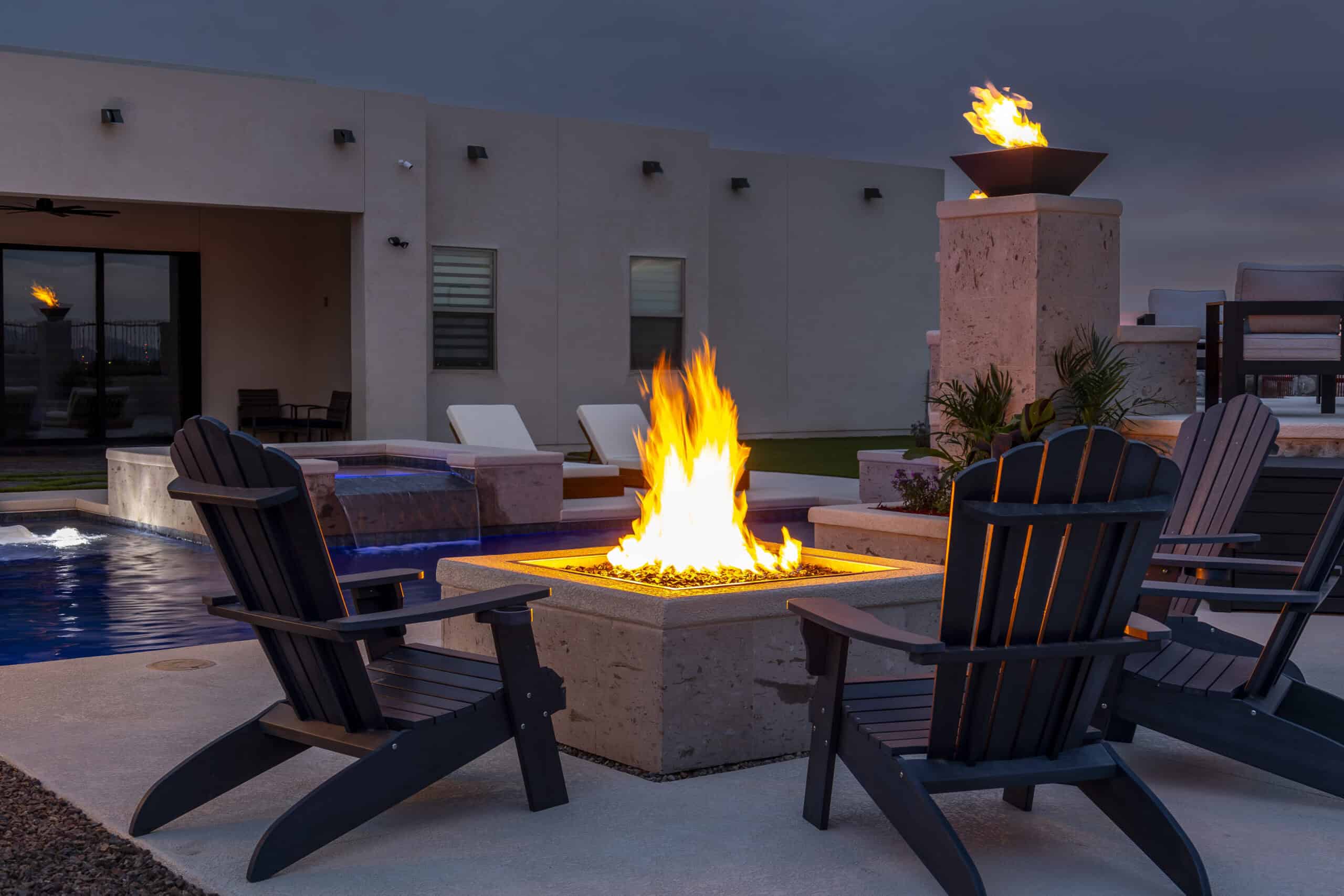 A raised terrace serves as the focal point of the backyard, combining linear fire features, fire bowls, and integrated water elements. Positioned above the pool, the terrace creates a strong architectural presence while enhancing both daytime views and nighttime ambiance.