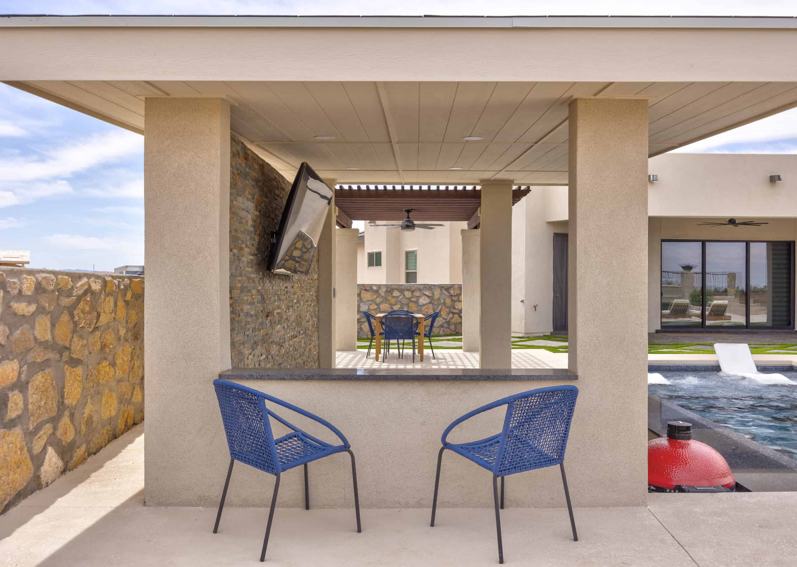 A fully integrated outdoor kitchen and shaded structure extend the usability of the space for entertaining and daily use.